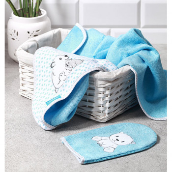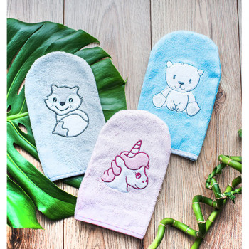 Dodatkowo myjka posiada naszytą aplikację ze zwierzątkiem odpowiadającą tematycznie okryciu kąpielowemu w tym samym kolorze.