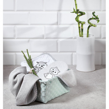 Dodatkowo myjka posiada naszytą aplikację ze zwierzątkiem odpowiadającą tematycznie okryciu kąpielowemu w tym samym kolorze.