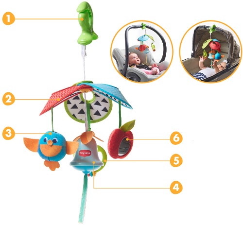 Znajome zabawki i funkcje tej podróżnej karuzeli będą towarzyszyć dziecku podczas każdej wyprawy. Poszczególne funkcje zabawki stymulują zmysły dziecka i wspierają rozwój umiejętności motorycznych.