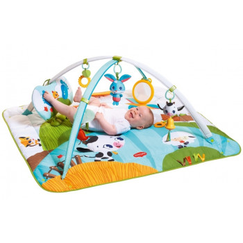 Przesuń pałąki do pozycji otwartej i ciesz się czasem, który spędzasz razem z dzieckiem, bawiąc się razem i zacieśniając więź, jednocześnie zachęcając do rozwoju. Pokaż dziecku różne aktywności maty, rozmawiaj o jej bohaterach za pomocą prostych zdań („Oto krówka!”), lub po prostu ciesz się cennym kontaktem z dzieckiem.