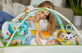 Angażujące lusterko oraz inne funkcje maty pomogą dziecku wydłużyć czas spędzony na brzuszku, który przyczyni się do rozwoju ruchów całego ciała.