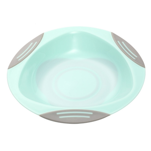 Gumowa przyssawka uniemożliwia przesuwanie się talerza po stole, chroniąc jednocześnie pokarm przed rozlaniem.