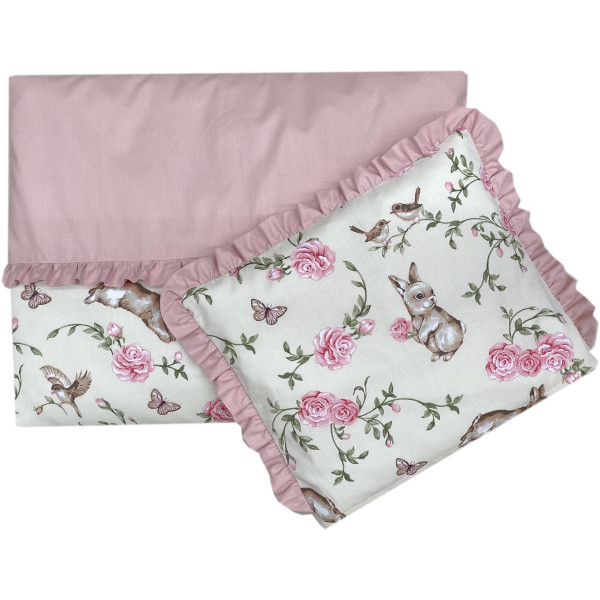 Śliczna pościel z falbankami do łóżeczka składająca się z 2 elementów.