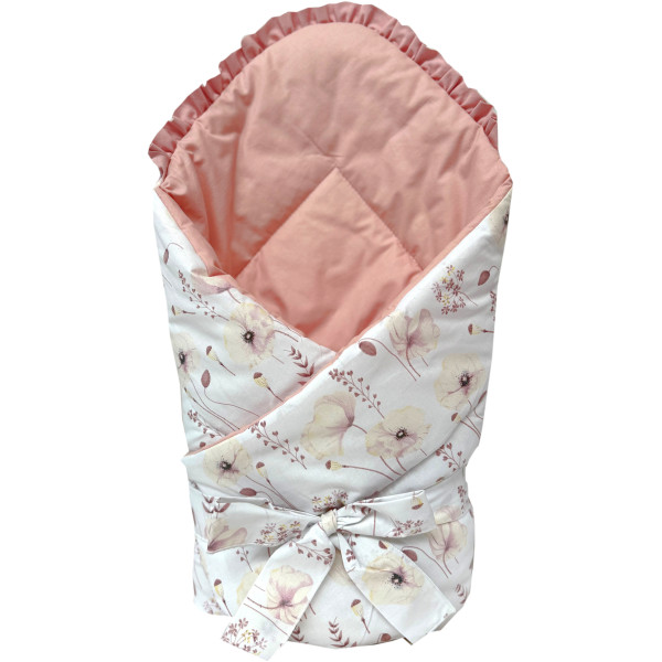 Obszyty jest w 100 % bawełnianą tkaniną. Posiada zaokrąglone brzegi i jest zapinany na szeroki rzep, dzięki czemu łatwo nadać mu odpowiedni kształt podczas otulania maluszka. Dodatkowo posiada tasiemkę, za pomocą której możemy dokładnie otulić maluszka.