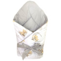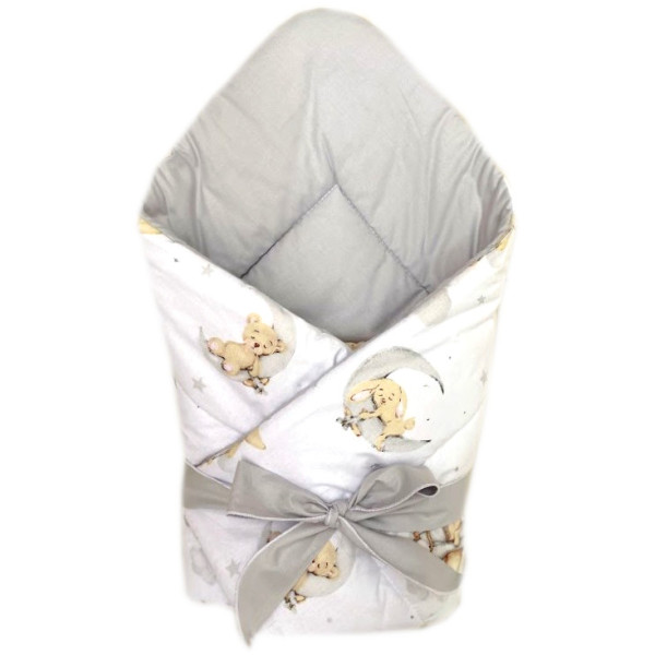 Obszyty jest w 100 % bawełnianą tkaniną. Posiada zaokrąglone brzegi i szeroki rzep, dzięki czemu łatwo nadać mu odpowiedni kształt podczas otulania maluszka. Dodatkowo posiada tasiemkę, za pomocą której możemy dokładnie otulić maluszka.