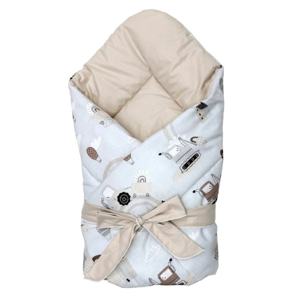 Obszyty jest w 100 % bawełnianą tkaniną. Posiada zaokrąglone brzegi i szeroki rzep, dzięki czemu łatwo nadać mu odpowiedni kształt podczas otulania maluszka. Dodatkowo posiada tasiemkę, za pomocą której możemy dokładnie otulić maluszka.