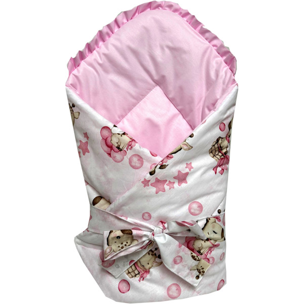 Obszyty jest w 100 % bawełnianą tkaniną. Posiada zaokrąglone brzegi i szeroki rzep, dzięki czemu łatwo nadać mu odpowiedni kształt podczas otulania maluszka. Dodatkowo posiada tasiemkę, za pomocą której możemy dokładnie otulić maluszka.