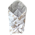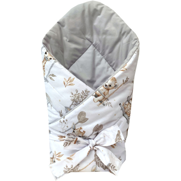 Obszyty jest w 100 % bawełnianą tkaniną. Posiada zaokrąglone brzegi i szeroki rzep, dzięki czemu łatwo nadać mu odpowiedni kształt podczas otulania maluszka. Dodatkowo posiada tasiemkę, za pomocą której możemy dokładnie otulić maluszka.