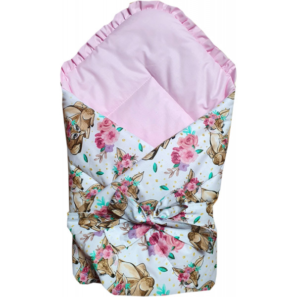 Obszyty jest w 100 % bawełnianą tkaniną. Posiada zaokrąglone brzegi i szeroki rzep, dzięki czemu łatwo nadać mu odpowiedni kształt podczas otulania maluszka. Dodatkowo posiada tasiemkę, za pomocą której możemy dokładnie otulić maluszka.