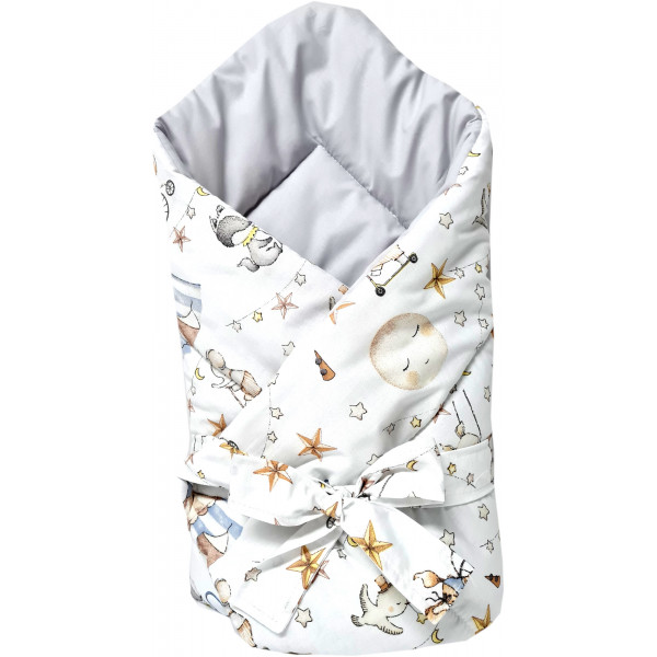 Obszyty jest w 100 % bawełnianą tkaniną. Posiada zaokrąglone brzegi i szeroki rzep, dzięki czemu łatwo nadać mu odpowiedni kształt podczas otulania maluszka. Dodatkowo posiada tasiemkę, za pomocą której możemy dokładnie otulić maluszka.