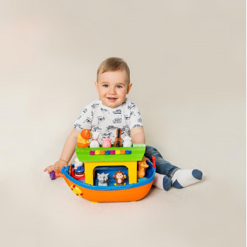Wspaniała arka Noego na pokładzie ma, aż 9 zwierzątek, które nagrodzą dzieci wesołymi odgłosami bądź zabawną rymowanką zawsze, kiedy odgadną one prawidłowy kształt i włożą je w odpowiednie miejsce. To wspaniała motywacja, aby poznawać nowe zagadnienia, nazwy zwierzątek, a także aby w naturalny sposób poznawać zależność przyczynowo - skutkową.